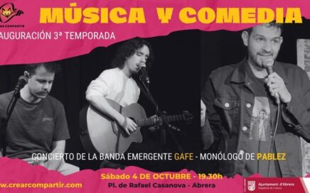 Dissabte 4 d’octubre de 2025 a les 19.30h l’Associació sociocultural Crear i Compartir d’Abrera obre la seva tercera temporada cultural amb un espectacle gratuït de MÚSICA I COMÈDIA a l’aire lliure que tindrà lloc a la Pl. Rafael Casanova d’Abrera. La proposta escènica està protagonitzada per l’humorista Pablez i per la banda emergent GAFE. Seguint […]